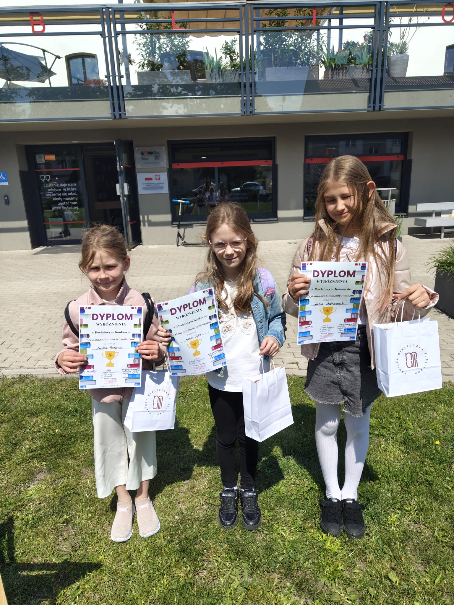 13 maja br., uczennice klas I-III wzięły udział w Powiatowym Konkursie "Czytam- Rozumiem -Odpowiadam" zorganizowanym w Rawickiej Bibliotece Publicznej w Rawiczu. Wyróżnienie otrzymały Amelia Barteczka z klasy I, Maria Dyba z klasy II oraz Lidia Antkowiak z klasy III. Dziewczynki znakomicie poradziły sobie z czytaniem i bezbłędnie odpowiedziały na pytania dotyczące przeczytanego tekstu. Wielkie brawa dla dziewczyn.