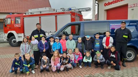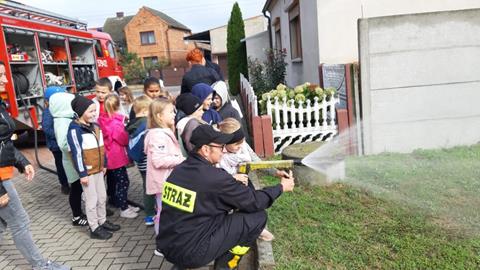 W środę 22 września uczniowie klas pierwszych odwiedzili remizę strażacką w Szkaradowie. Uczniowie poznali specyfikę pracy strażaka, obejrzeli wyposażenie wozu strażackiego, przymierzali kaski strażackie, mieli możliwość samodzielnego składania węża strażackiego oraz pryskania wodą z węża. Ogromną atrakcją była przejażdżka wozem strażackim. Dziękujemy serdecznie strażakom ochotnikom panu Michałowi Barteczce orz panu Januszowi Sierpowskiemu za moc wrażeń i słodkości, które przygotowali dla uczniów.