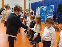 Dzień Edukacji Narodowej jest okazją do wyrażenia wdzięczności za wysiłek włożony w wychowanie i wielkie serce wkładane na rzecz pracy z dziećmi. W tym dniu pamiętamy o wszystkich pracownikach szkoły. Właśnie z tej okazji 14 października 2021 roku cała społeczność naszej szkoły spotkała się najpierw na Mszy Świętej, a później na Uroczystym Apelu. Uczniowie poprzez program artystyczny wyrazili swoje podziękowanie za gorące serce, pomocną dłoń oraz przewodnictwo na niezwykle trudnej drodze do zdobywania wiedzy. Ten dzień był też doskonałą okazją do wręczenia wszystkim pracownikom szkoły podziękowań i kwiatów, przyznania nagród Dyrektora, życząc jednocześnie satysfakcji i radości z wykonywanej pracy, a także dalszych sukcesów w zawodzie nauczyciela. Swoje święto obchodzili też uczniowie klas II. Ze względu na warunki epidemiologiczne, w ubiegłym roku szkolnym nie mogło odbyć się ich Pasowanie na Ucznia. I to właśnie podczas Uroczystej Akademii, czekała na uczniów klas II niespodzianka- zostali Pasowani na Ucznia.