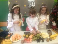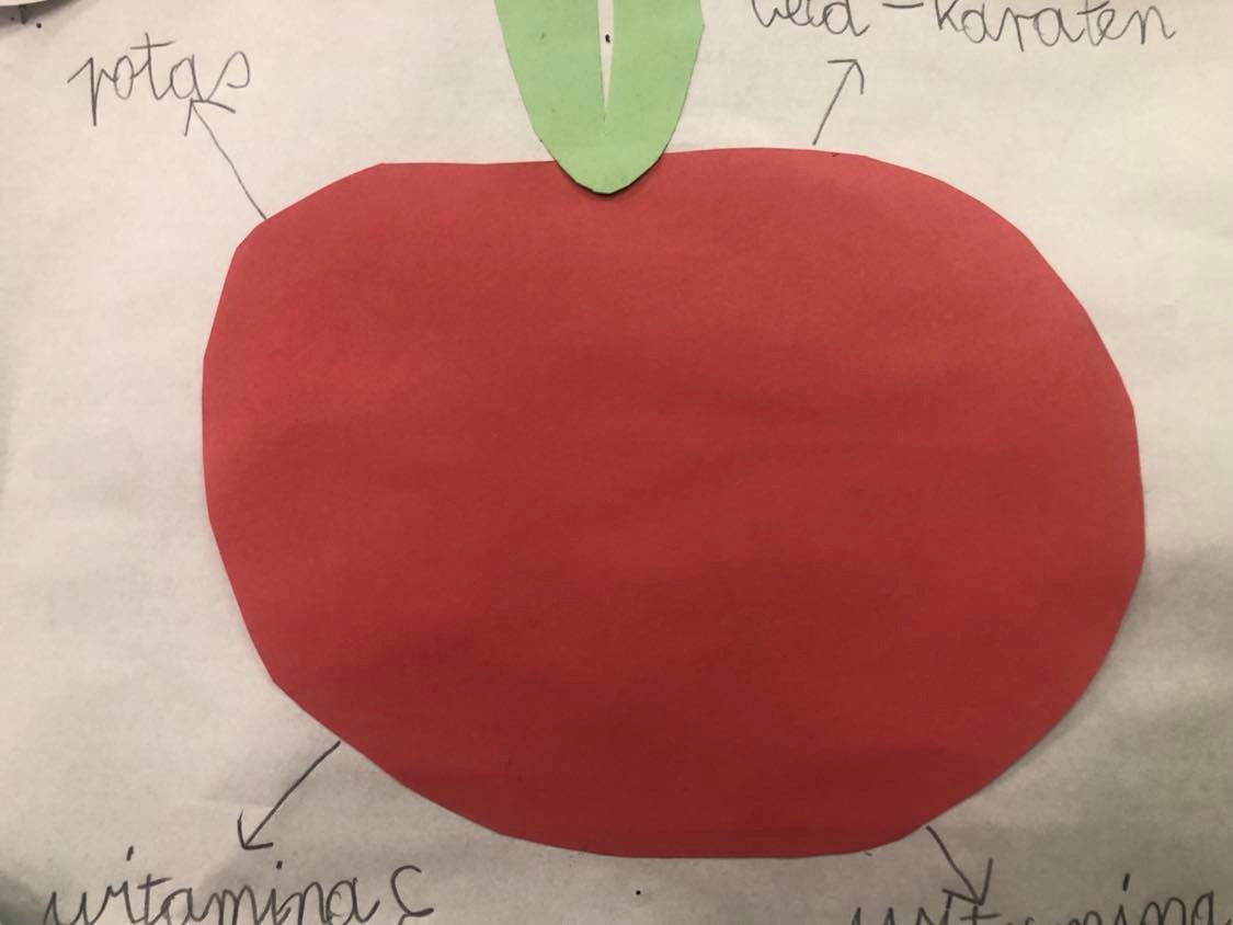 Były też wierszyki i bajki owocowo – warzywne. Dominik napisał i zilustrował bajkę o przygodach rodziny jabłuszek. Paweł natomiast wierszyk o witaminach i ich wpływie na nasze zdrowie. Podsumowaniem działań była inscenizacja wiersza Jana Brzechwy „Na straganie”. Dzieci same rozdzieliły role, dopasowały swoje stroje zamieniając się w warzywa ze straganu. W czasie przygotowań i wspólnej, wesołej zabawy i nauki jednocześnie, dzieci dalej zdobywały wiedzę na temat walorów zdrowotnych warzyw i owoców oraz zmiany nawyków żywieniowych. W kolejnych dniach chętnie zaglądały do naszego warzywno-owocowego koszyka, zapisywały ich nazwy utrwalając jednocześnie zasady ortograficzne, układały zagadki i wymyślały bajki rozwijając wyobraźnię. Wszystkie podjęte działania dostarczyły dzieciom nie tylko wiedzę ale też mnóstwo pozytywnych emocji.
