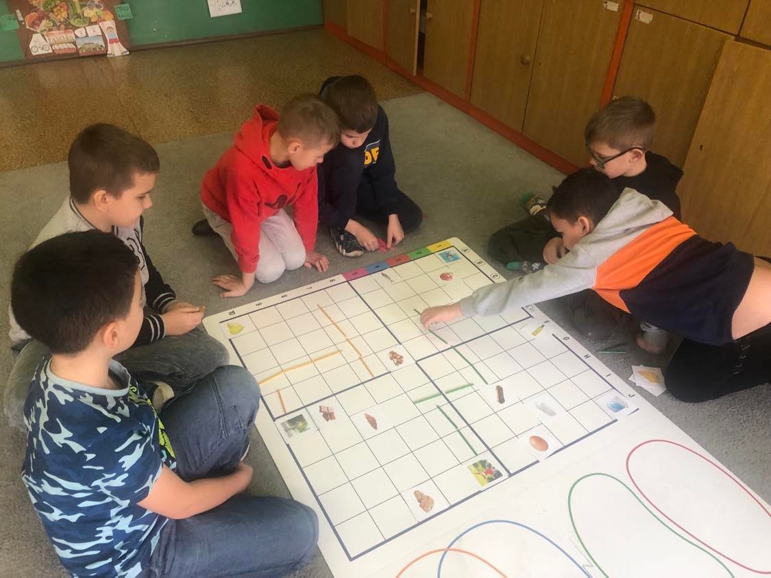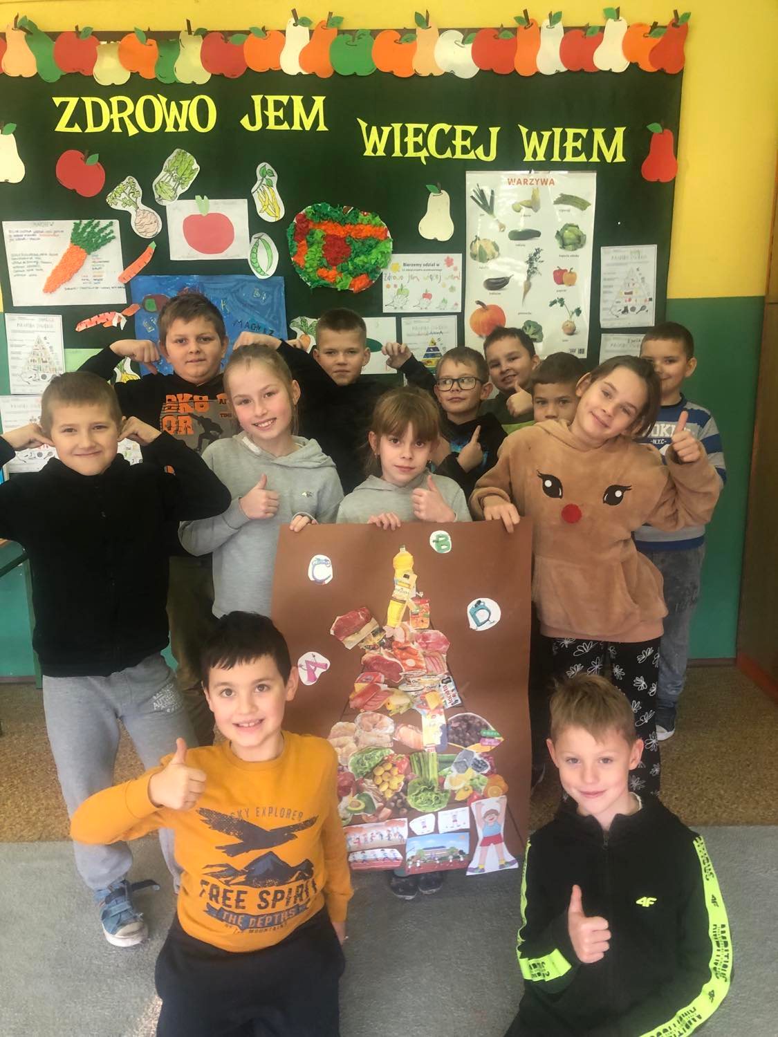 Dobrym sposobem na utrwalenie nowej wiedzy i wspaniałą zabawę, okazał się konkurs na grę planszową, której tematem przewodnim była Piramida Zdrowia. Wszystkie dzieci z dużym zaangażowaniem i emocjami włączyły się do pracy. Najpierw wspólnie stworzyliśmy grę ” Ścieżka zdrowia”, do której wykorzystaliśmy planszę do kodowania i karty przedstawiające produkty żywnościowe. Wspólna rywalizacja stała się dobrą inspiracją dla dzieci, które z ciekawymi pomysłami przystąpiły do pracy w zespołach. W sumie w klasie powstało 6 gier, w formułowaniu zasad niektórym dzieciom pomogli rodzice zaznaczając w ten sposób swój wkład. Ich autorzy bardzo poważnie podeszli do tematu zapoznając szczegółowo z celem gry i jej zasadami. Za najciekawszą wybrały grę pt. „Owocowe zagadki” wykonaną przez Pawła i Dominika. Po pracy umysłowej nieodzowna okazuje się zawsze porcja ruchu w postaci gimnastyki lub ćwiczeń przy muzyce, jak też aktywność sportowa, którą dzieci uwielbiają.