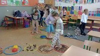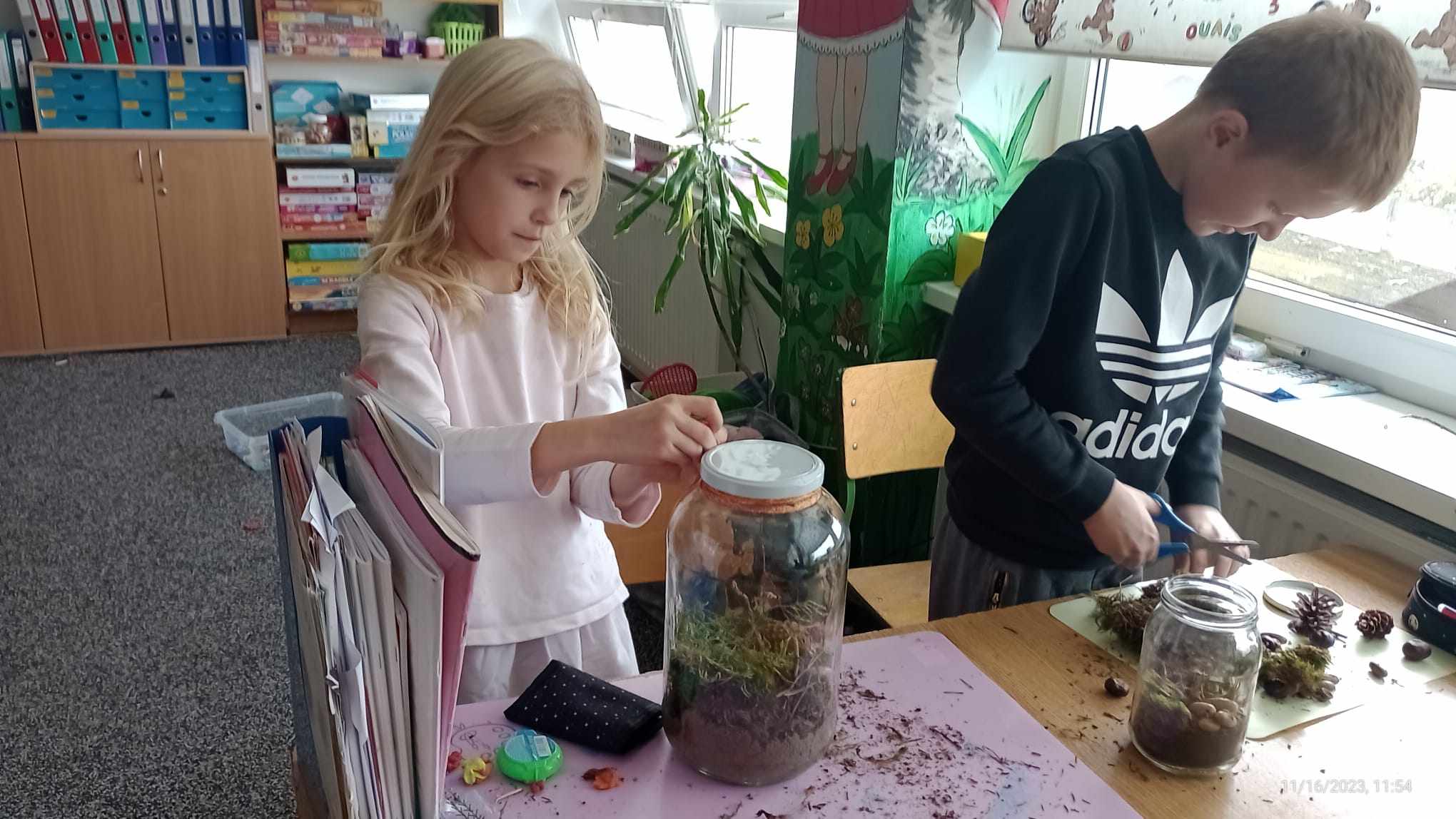 Kolejne działania drugoklasistów w ramach realizowanego projektu edukacyjnego ,, Gramy w zielone " . Ścieżka sensoryczna z materiałów przyrodniczych i las w szkle.