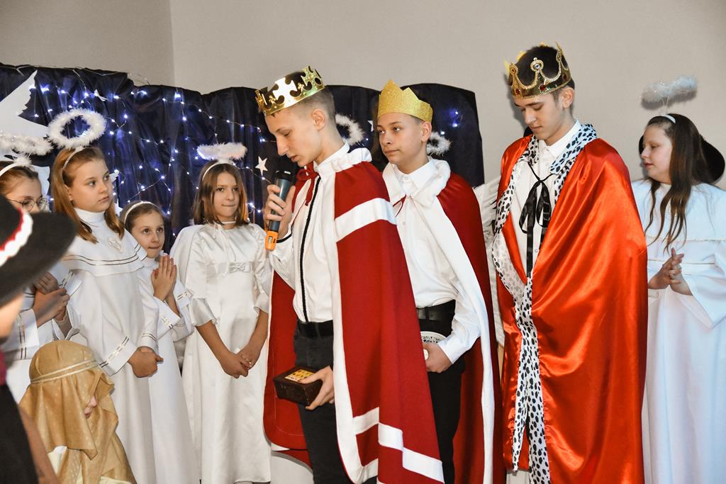 W minioną niedzielę sala w Szkaradowie stała się miejscem magicznego wydarzenia, które zgromadziło nie tylko uczniów i nauczycieli Szkoły Podstawowej im. Stanisława Ratajczaka w Szkaradowie, ale również rodziców, dziadków, ciocie i wujków oraz sąsiadów i innych przedstawicieli lokalnej społeczności. Występ jasełkowy, przygotowany przez uczniów pod opieką nauczycieli, zachwycił wszystkich obecnych. Jasełka to coroczna tradycja, która łączy pokolenia i przypomina o wartościach świąt Bożego Narodzenia: miłości, pokoju i wspólnocie. W tym roku uczniowie zaprezentowali niezwykle poruszającą interpretację historii narodzin Jezusa, wzbogaconą o piękne kolędy i pastorałki. Każdy z występujących wcielił się w swoją rolę z ogromnym zaangażowaniem, co nie umknęło uwadze widowni. Wszyscy młodzi aktorzy, a było ich 50 pokazali swoje talenty aktorskie, wokalne i artystyczne. Dekoracje, przygotowane z dbałością o detale, przeniosły wszytkich w klimat Betlejem, a kostiumy dodatkowo podkreślały autentyczność przedstawienia. Wydarzenie było także okazją do wspólnego śpiewania kolęd. Publiczność chętnie przyłączyła się do wykonania takich utworów jak „Pójdźmy wszyscy do stajenki” czy „Lulaj go Matko lulaj”. Wspólne kolędowanie sprawiło, że każdy poczuł się częścią tej niezwykłej chwili.Magiczne przedstawienie wspólnie z uczniami przygotowały nauczycielki: Iwona Eliasz, Katarzyna Frąckowiak, Katarzyna Chmielarczyk, Joanna Kapała ze wsparciem całego grona i dyrektora. Rada Rodziców szkoły włączyła się w organizację tego przedsięwzięcia i przygotowała dla wszystkich przybyłych ciepłe napoje i słodkie przekąski. Dziękujemy wszystkim, którzy zaszczycili nas swoją obecnością i stworzyli niepowtarzalną atmosferę. Zdjęcia zostały zrobione i udostępnione przez Panią Jowitę Maryniak. Jasełka szkolne to wydarzenie, które na długo pozostanie w naszych sercach. Dziękujemy za wspólnie spędzony czas i już teraz zapraszamy na kolejne przedstawienia w przyszłym roku. Niech magia świąt towarzyszy nam wszystkim przez cały rok!