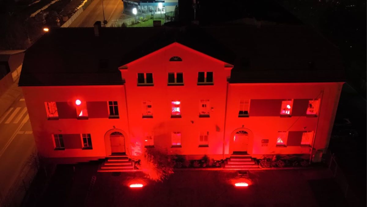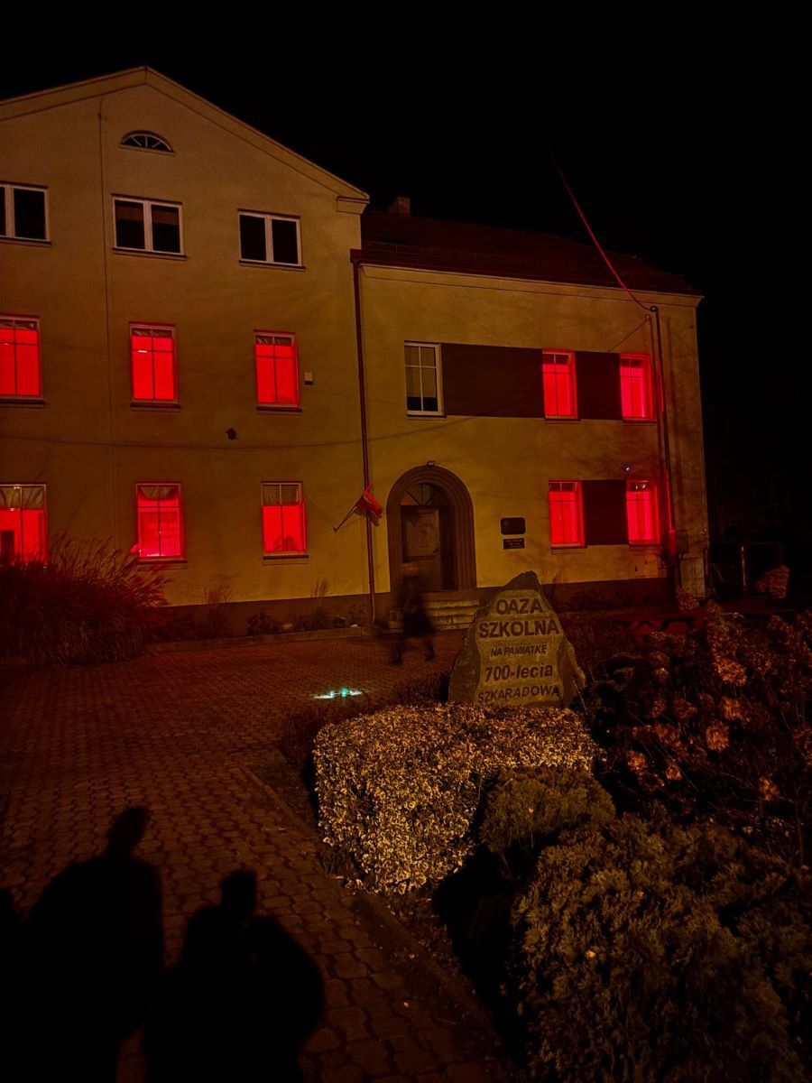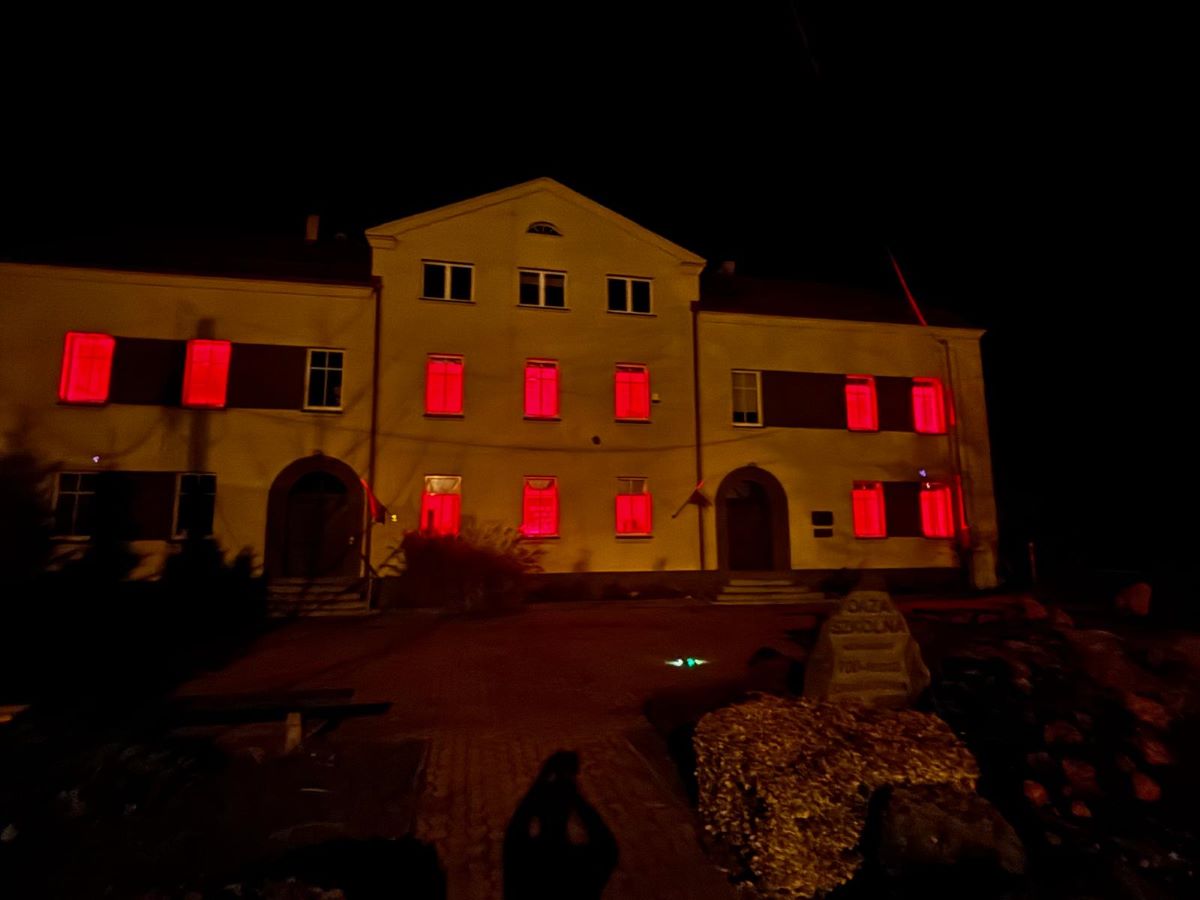 Wieczorem nasza szkoła została podświetlona na czerwono, dołączając tym samym do ogólnopolskiej inicjatywy budowania świadomości na temat przeciwdziałania przemocy wobec najmłodszych.