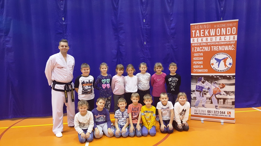 Dzięki uprzejmości p. Radosława Cichowlas, uczniowie naszej szkoły mogli poznać tajniki treningu taekwondo. Wszyscy uczniowie klas 1-6 zostali podzieleni na kilkunastoosobowe grupy i wzięli udział w kilkudziesięciominutowym treningu. Zajęcia bardzo się podobały i były przeprowadzone przez profesjonalnego trenera – pana Radosława. Mamy nadzieję, że uda się jeszcze zorganizować pokazowy trening dla starszych kolegów. Istnieje możliwość bliższego zapoznania się z tą ciekawą dyscypliną sportową. Zapisy trwają :-)
