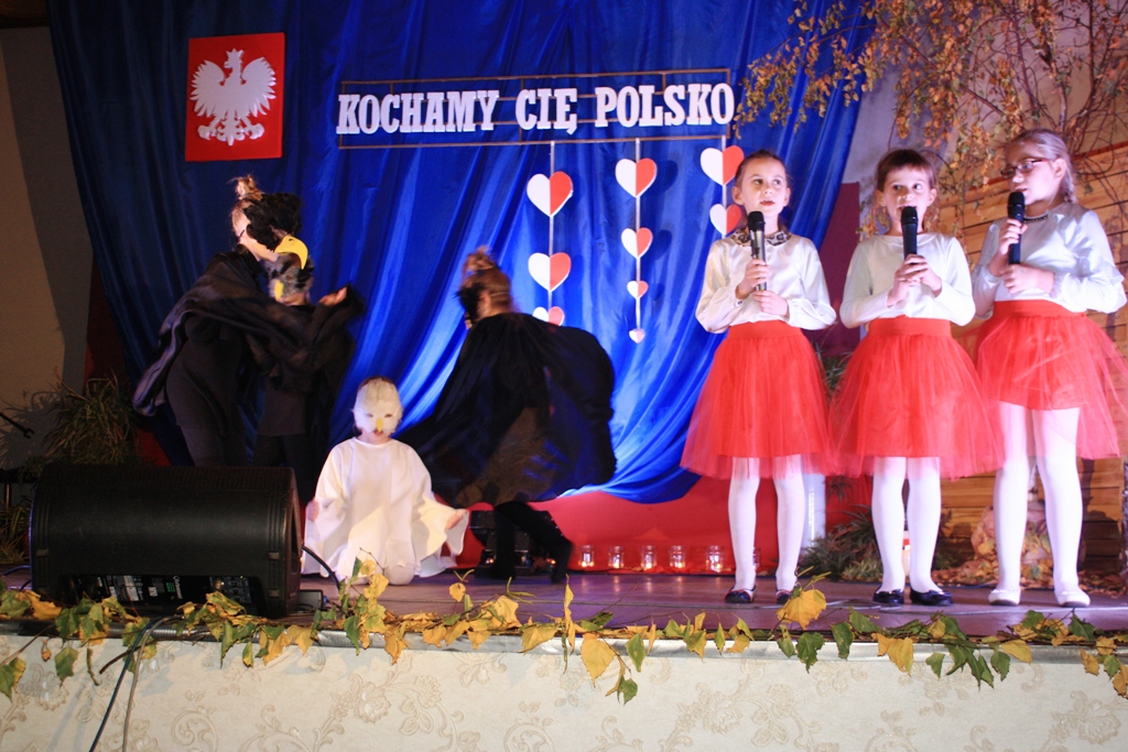 Bardzo widowiskowo wyglądały też wspaniałe inscenizacje i tańce w wykonaniu uczniów klas I-III i IV. Wyjątkowego splendoru dodały im specjalne efekty świetlne przygotowane przez firmę „Vega”. Dodatkowym urozmaiceniem wieczoru był występ szkolnego zespołu obrzędowego „Szakiety”, który zaprezentował się w tradycyjnych, ludowych strojach. Montaż słowno-muzyczny był tak skonstruowany, że przedstawiał kolejne etapy w dziejach Polski prowadzące do odzyskania niepodległości. Nie zabrakło również nawiązania do historii kraju po roku 1918. Wówczas na scenie pojawili się gimnazjaliści w żołnierskich strojach.