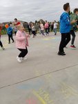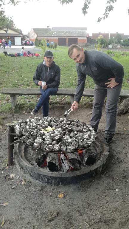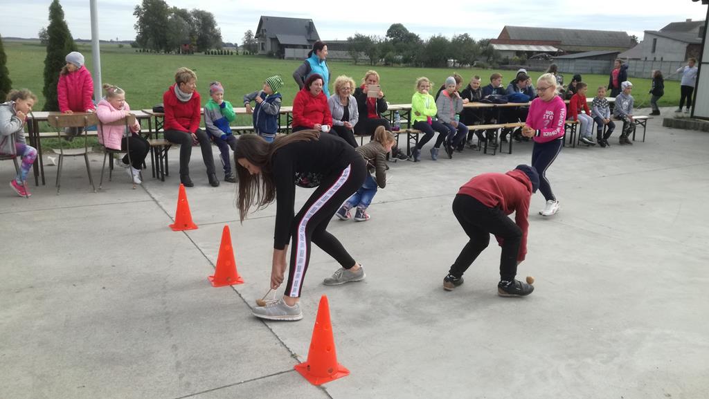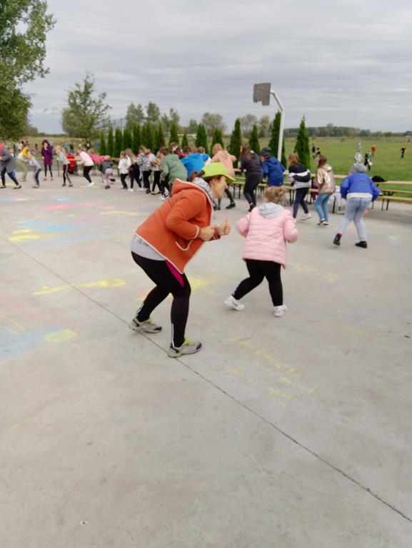 W czasie imprezy każdy spędzał czas w sposób na jaki miał ochotę. Można było posiedzieć przy ognisku, wylegiwać się na kocu, łowić ryby w stawie, grać w piłkę albo uczestniczyć w zabawach organizowanych przez nauczycieli: odbyły się zawody z pyrą w roli głównej, przeciąganie liny, malowanie obrazków kredą na betonie, puszczanie baniek mydlanych i tańce, tańce, tańce… Oprawę muzyczną zapewnił DJ Wituś z Ostój. Wreszcie mogliśmy też sobie porozmawiać „na luzie”, poznać dziecięce zainteresowania i porządnie się natlenić, korzystając z październikowej aury. Jedliśmy kiełbaski wspaniale ugrillowane przez pana Rysia oraz pieczone ziemniaki, wcześniej przygotowane przez panie Anetę i Marzenę a na ognisku pilnowane przez pana Mirka.