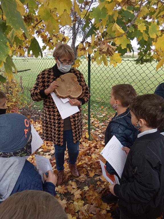 W piątek uczniowie klasy 2b uczestniczyli w lekcji terenowej, którą poprowadziła Pani Dyrektor Irmina Gilicka Zalas ? W ramach projektu edukacyjnego, w którym uczestniczy klasa ,dzieci dowiedziały się wielu ciekawych rzeczy o drzewach ?? szukaliśmy nazw gatunków drzew w atlasach, mierzyliśmy obwód pnia, liczyliśmy wiek drzewa i obrysowaliśmy pnie drzew na kartce.