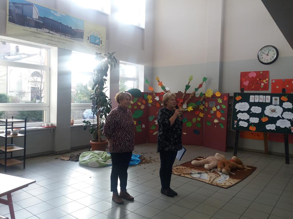 Druga część imprezy związana była z projektem Szkoły Promującej Zdrowie „Dynia jest do jedzenia, a nie do straszenia!” Każda klasa brała udział w pokazie prezentacji mulimedialnej na temat dyni. Uczniowie mogli dowiedzieć się skąd pochodzi dynia, jakie są jej odmiany i jakie posiada wartości odżywcze. Po obejrzeniu projekcji i zabawach, każda klasa mogła udać się na degustację potraw z tego niezwykłego warzywa. Były przepyszne ciasta, ciasteczka, babeczki, a także konfitury i soki. Wszystkie specjały powstały dzięki ogromnemu zaangażowaniu rodziców. Zapach, który roznosił się po całej szkole zapraszał uczniów do ostatniego punktu, a mianowicie na degustację cieplutkich, chrupiących racuszków z dyni. Te pyszne placuszki przygotowane zostały przez panią Teresę Tyczyńską, panią Alinę Sierpowską oraz nasze kochane panie z obsługi.