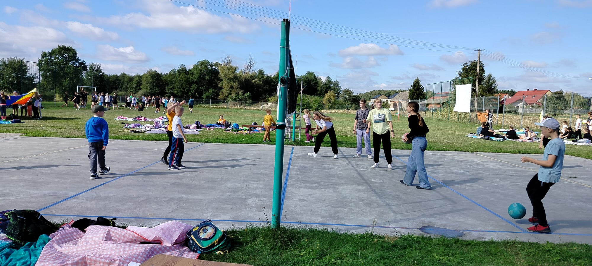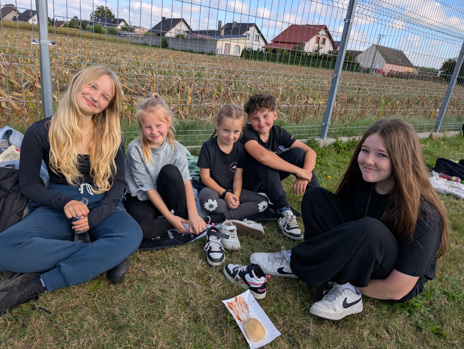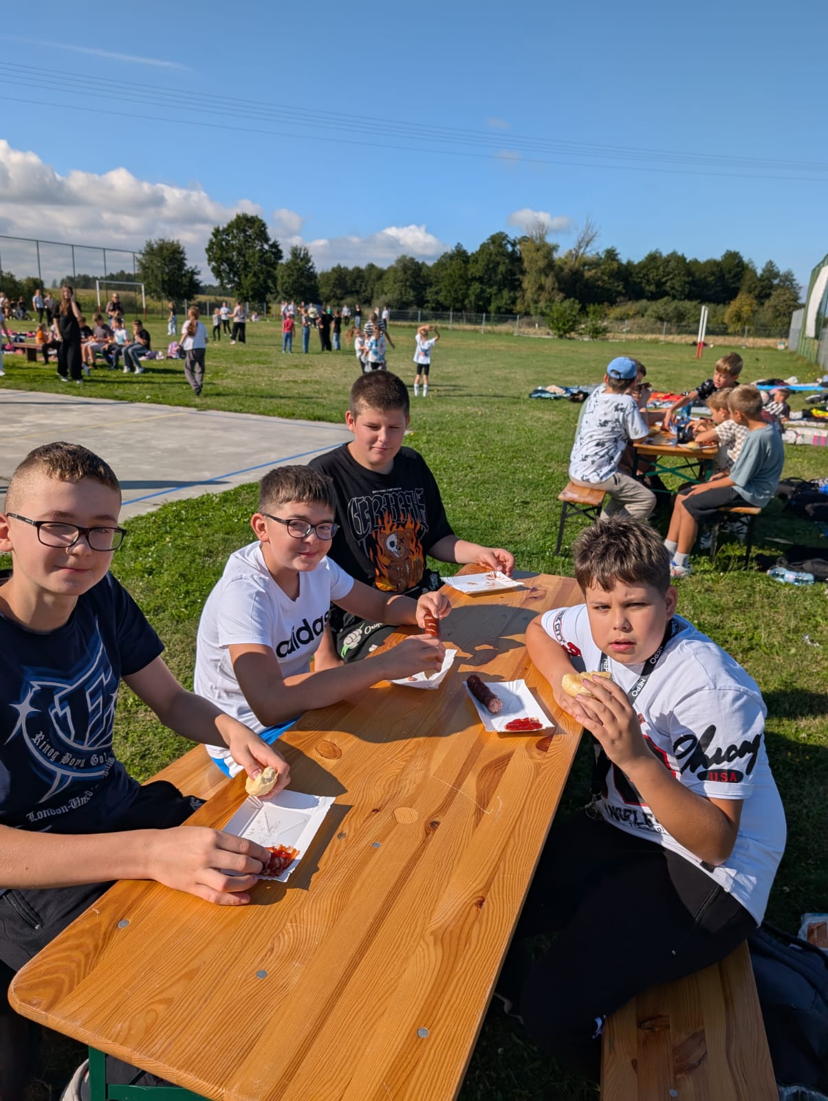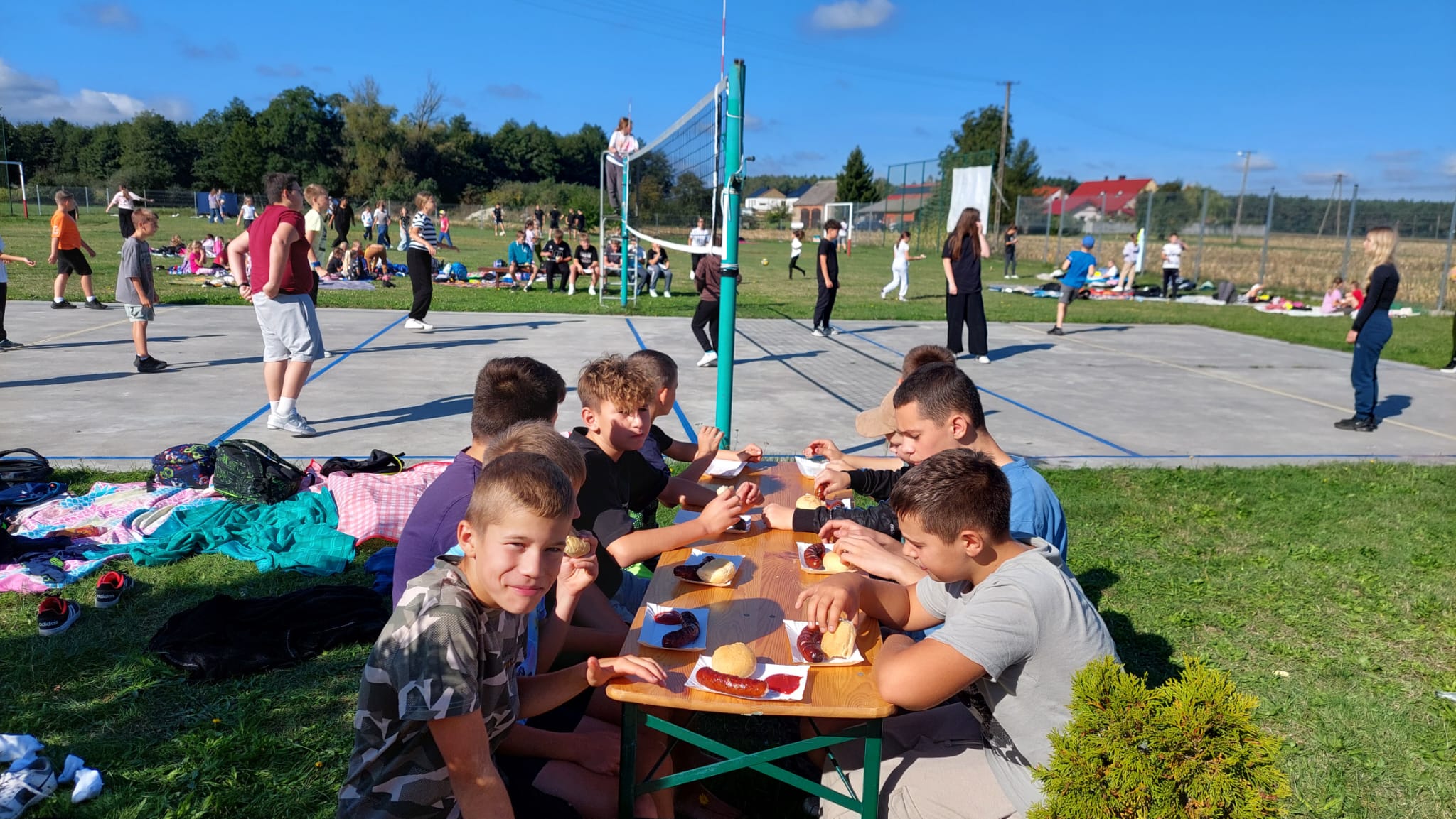 19 września 2025 roku odbył się w naszej szkole wyjątkowy „Dzień Pieczonego Ziemniaka”. Wszyscy uczniowie wraz z nauczycielami udali się do Jezior, aby miło i aktywnie spędzić czas na świeżym powietrzu. Pogoda była wymarzona, cały dzień towarzyszyło nam piękne, słoneczne niebo, co dodatkowo umiliło wspólną zabawę. Na uczestników czekało wiele atrakcji i niespodzianek. Odbywały się emocjonujące rozgrywki sportowe, zabawy z chustą animacyjną, a dziewczynki z zapałem skakały na skakance, bijąc własne rekordy i świetnie się przy tym bawiąc. Dla tych, którzy preferują spokojniejsze formy wypoczynku, był też czas na leniuchowanie i przyjacielskie rozmowy. Po wspólnej zabawie wszyscy mogli posilić się pyszną, chrupiącą kiełbaską i pachnącymi pieczonymi ziemniakami, przygotowanymi na grillu przez naszych niezawodnych pracowników obsługi.