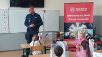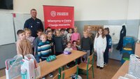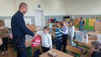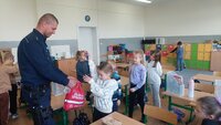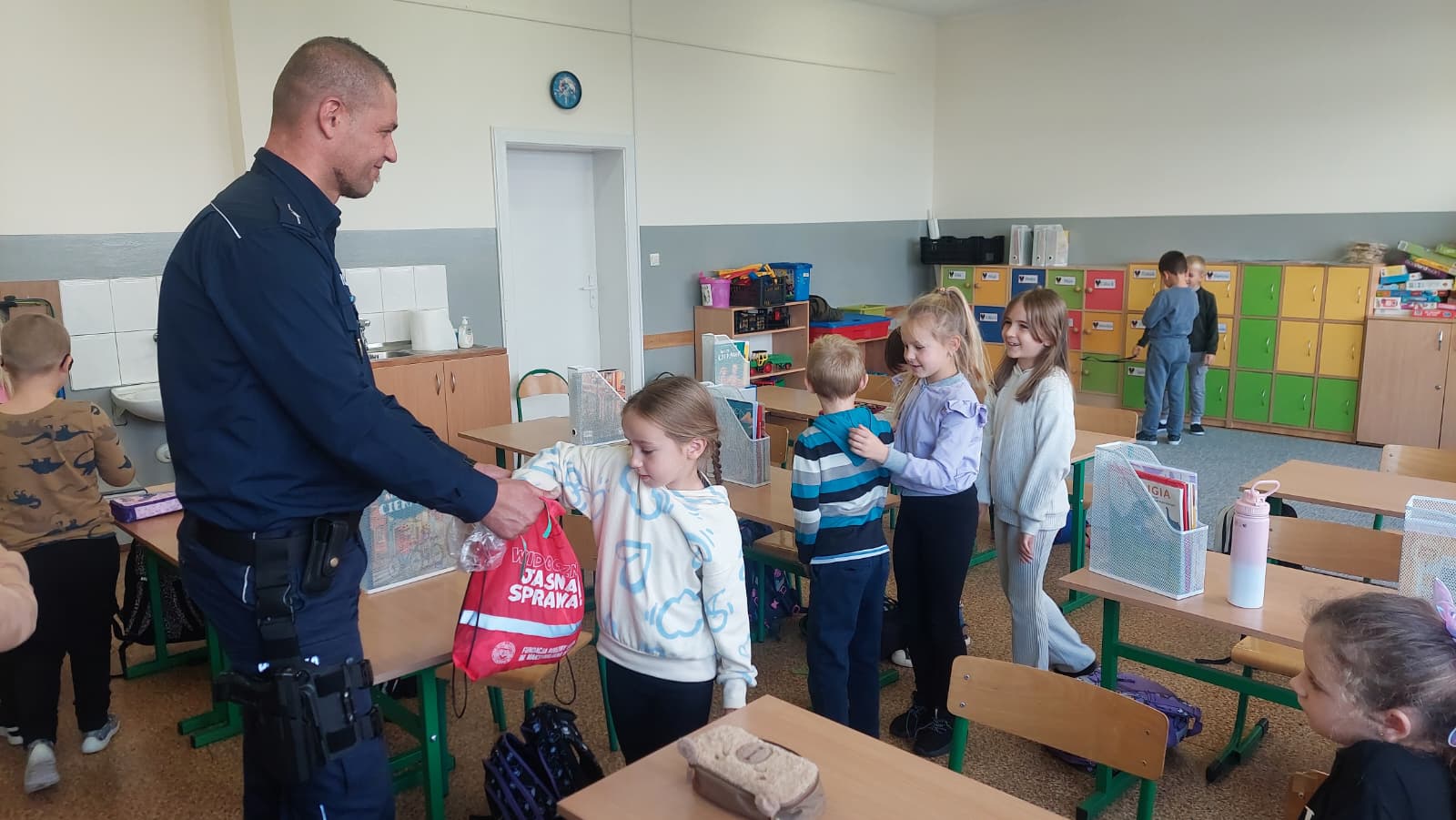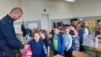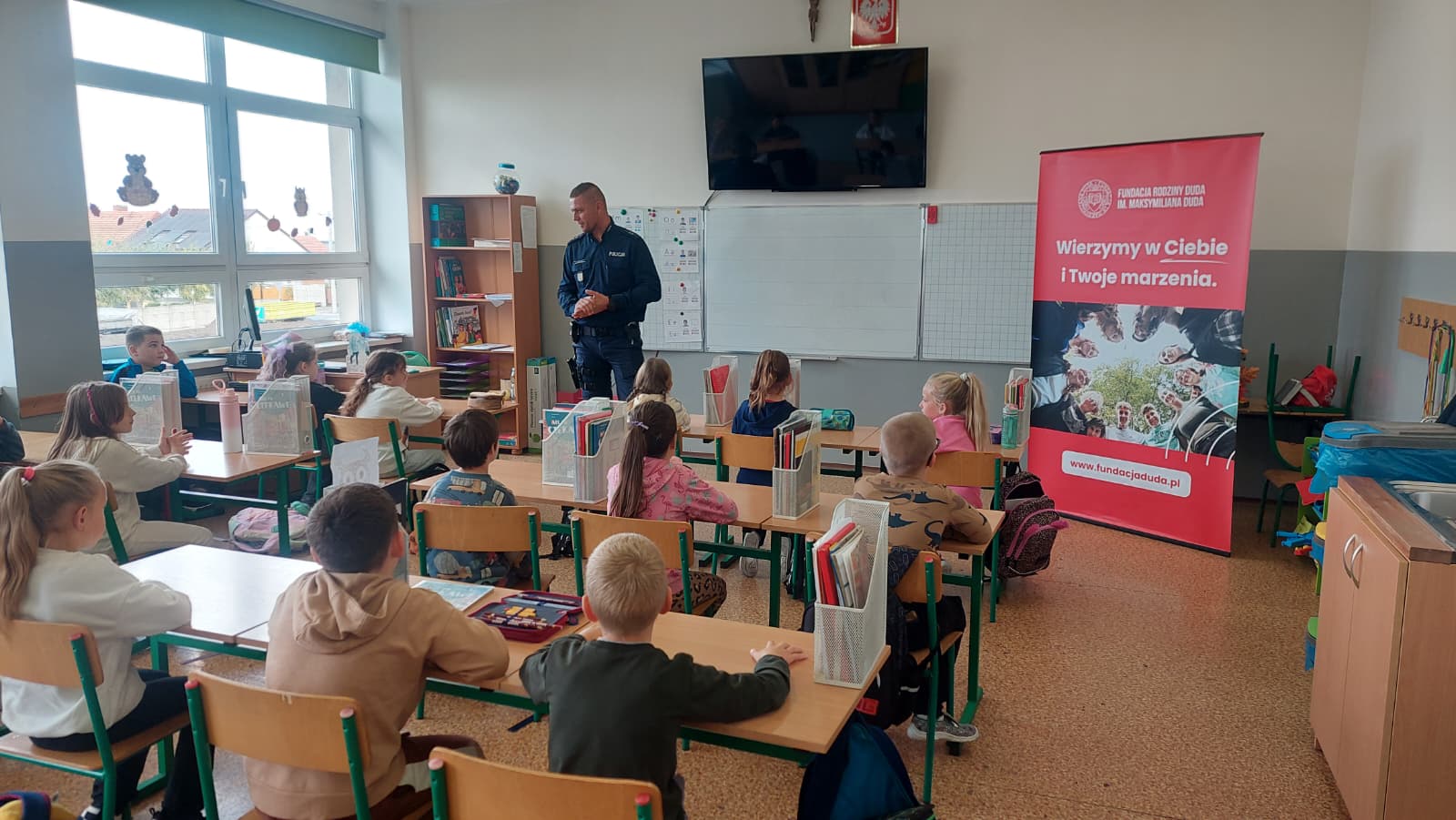 W piątek 10 października uczniowie klasy I gościli na zajęciach funkcjonariusza KPP w Rawiczu - Arkadiusza Wróblewskiego.Tematem spotkania było bezpieczeństwo pieszych w ruchu drogowym. Zajęcia odbyły się pod patronatem Fundacji Rodziny Duda im. Maksymiliana Duda.Uczniowie zostali wyposażeni w wiedzę potrzebną do właściwego i bezpiecznego zachowywania się w ruchu drogowym oraz otrzymali drobne upominki. Dziękujęmy za ciekawe spotkanie i przekazaną wiedzę.