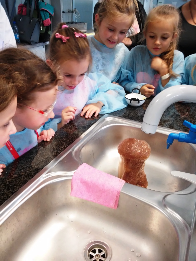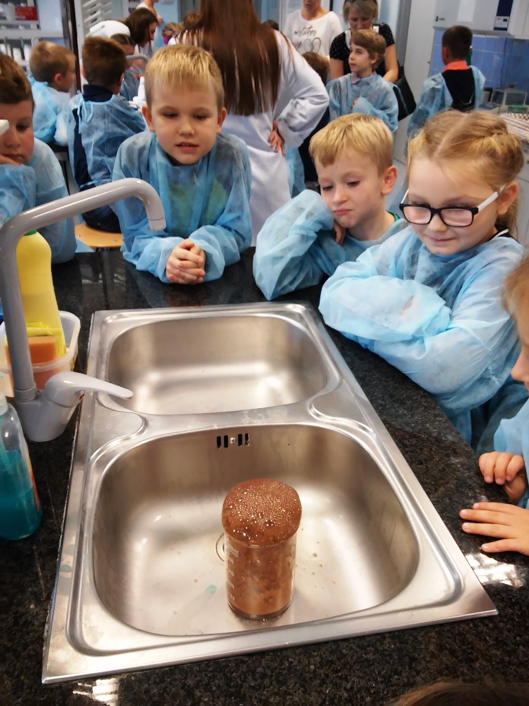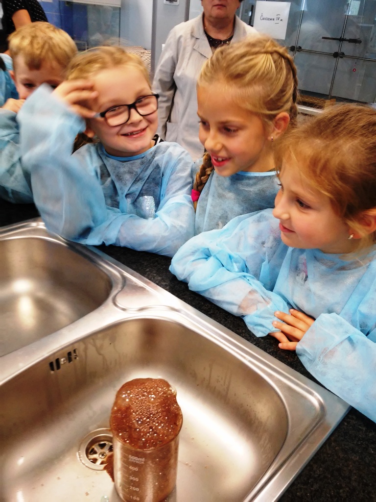 27 września dzieci ze świetlicy szkolnej oraz II klasa szkoły podstawowej uczestniczyły w zajęciach na Wydziale Farmacji Uniwersytetu Medycznego w ramach XX Dolnośląskiego Festiwalu Nauki. W tym roku w zajęciach pt: „Kosmetyki pachnące czekoladą” wzięło udział 24 uczniów. Dzieci przy pomocy asystentów wydziału farmacji przygotowały m.in.: czekoladowy balsam do ust, czekoladowy krem, czekoladowy peeling do ciała oraz sprawdziły reakcję przy kontakcie z wodą musujących kul czekoladowych.