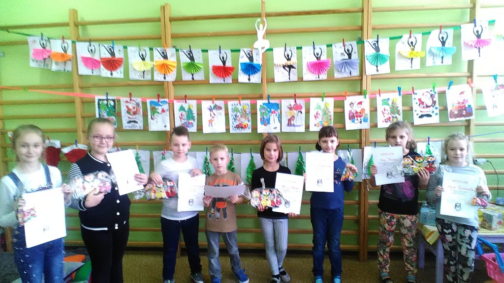 Świetlica zorganizowała konkurs na najładniejszą kartkę świąteczną. Wszystkie prace były ciekawie wykonane. Uczestnicy otrzymali pamiątkowe dyplomy oraz cukierki a zwycięzcy nagrody. Wszystkie kartki wysłaliśmy do chorych dzieci. Dziękujemy za uczestnictwo i zapraszamy do udziału w następnych konkursach.